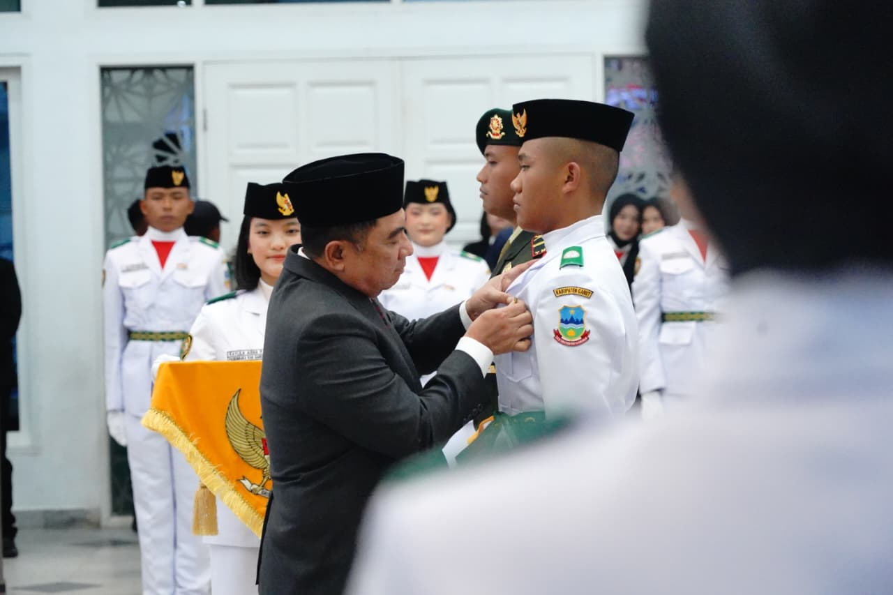 GARUT BERKABAR, Garut Kota – Menjelang detik-detik peringatan Hari Ulang Tahun (HUT) ke-80 Republik Indonesia, suasana Gedung Pendopo Garut pada Jumat (15/8/2025) dipenuhi nuansa khidmat. Bupati Garut, Abdusy Syakur Amin, memimpin langsung pengukuhan 35 anggota Pasukan Pengibar Bendera Pusaka (Paskibraka) tingkat Kabupaten Garut tahun 2025.