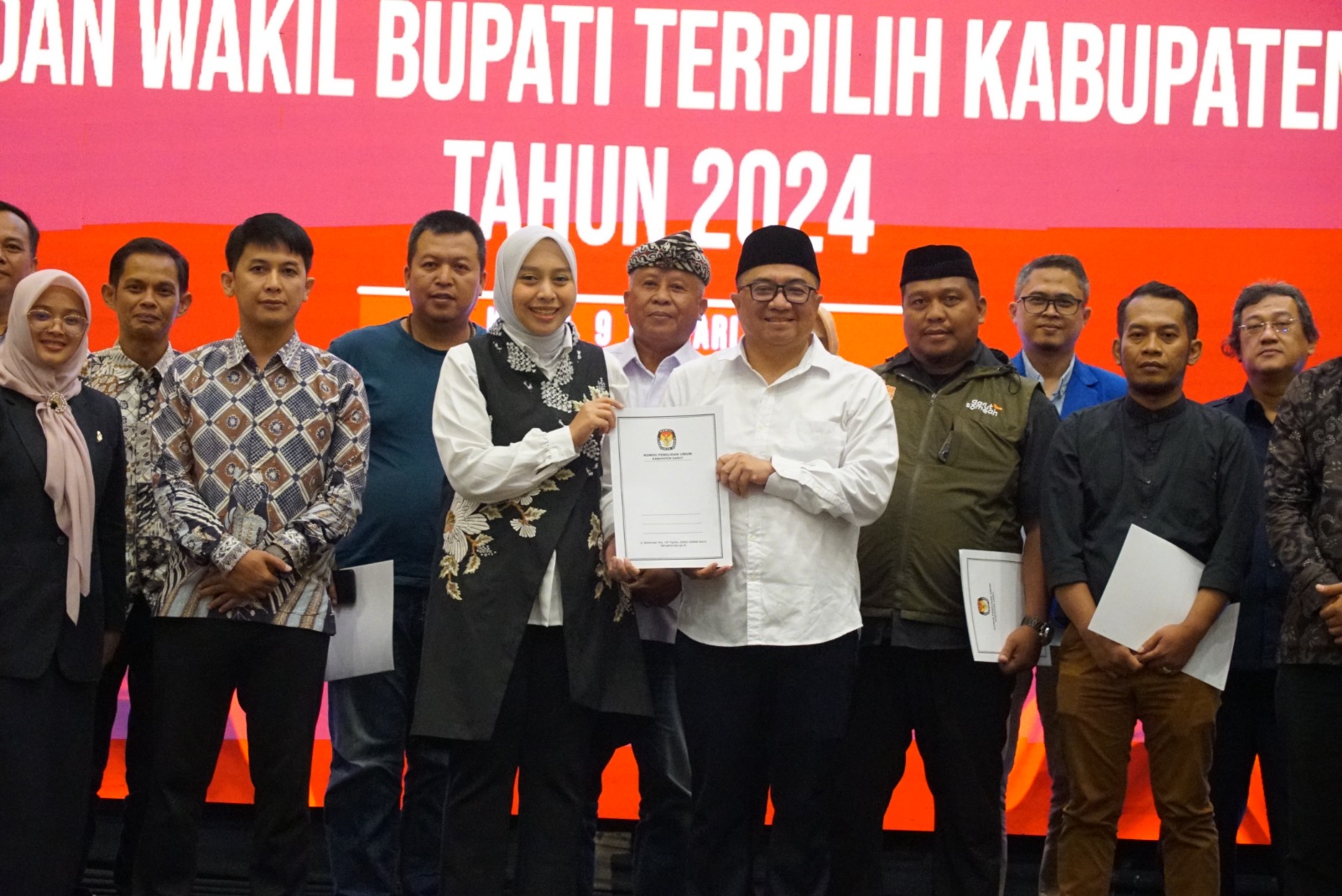 GARUT BERKABAR, Tarogong Kaler – Komisi Pemilihan Umum (KPU) Kabupaten Garut mengesahkan Abdusy Syakur Amin dan Luthfianisa Putri Karlina sebagai pasangan calon terpilih Bupati dan Wakil Bupati Garut dalam Rapat Pleno Terbuka yang diselenggarakan di Ballroom Hotel Santika, Kecamatan Tarogong Kaler, Kamis (9/1/2025).