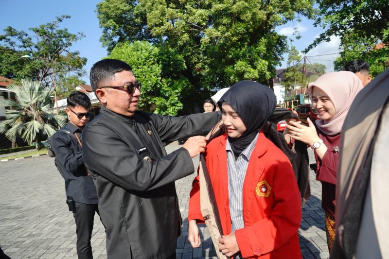Bupati Garut, Abdusy Syakur Amin, memimpin upacara pelepasan peserta Kuliah Kerja Nyata (KKN) Gradasi (Gotong-royong Akademisi Bersinergi dan Berinovasi) di Sekretariat Daerah Kabupaten Garut, Jalan Pembangunan, Kecamatan Tarogong Kidul, Kamis (9/10/2025).
