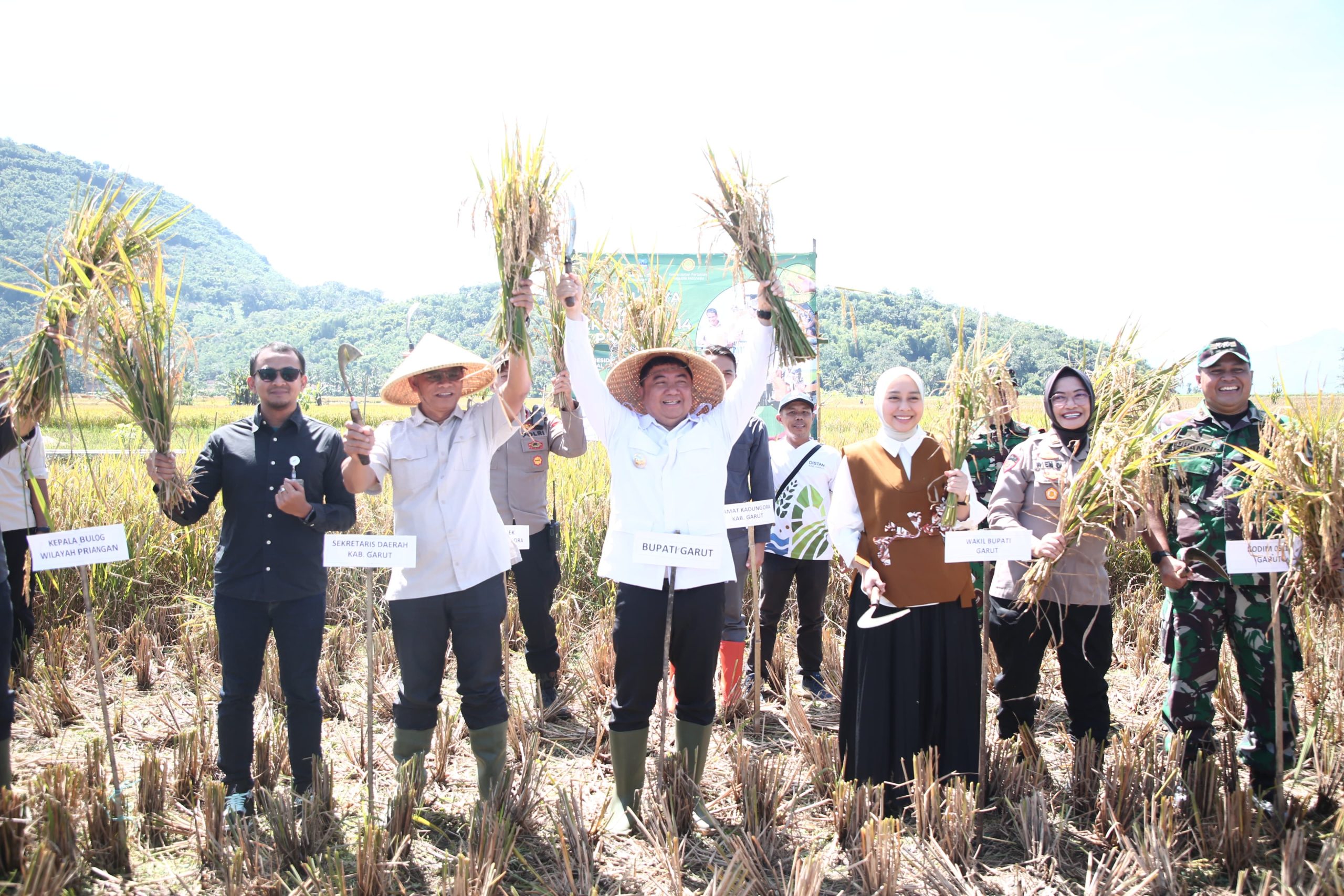 Bupati Garut Abdusy Syakur Amin (kiri) bersama Wakil Bupati dan jajaran Forkopimda menghadiri Panen Raya Padi Serentak di 14 provinsi secara daring bersama Presiden RI, di lahan Desa Cikembulan, Kadungora, Senin (7/4/2025). Acara ini mempertegas peran petani sebagai pilar utama ketahanan pangan nasional.