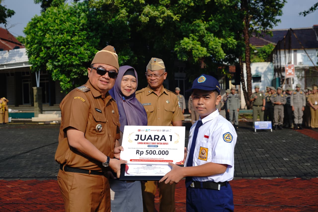 Dalam kesempatan itu, salah satu pemenang dari kategori SD, Jovan Adi M (SDN 1 Pakuwon), turut membacakan surat karyanya di hadapan peserta apel.