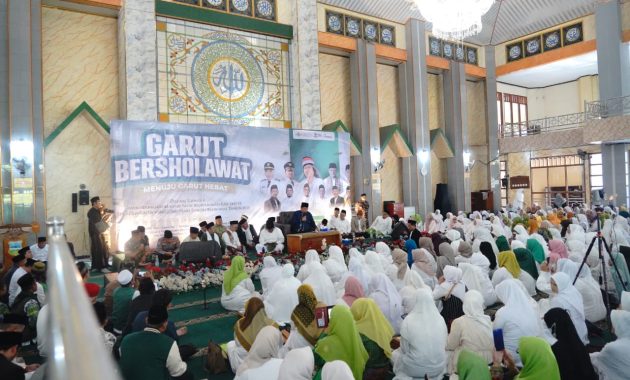 GARUT BERKABAR, Garut Kota – Suasana religius menyelimuti Masjid Agung Garut pada Sabtu (4/10/2025), saat ribuan jamaah menghadiri Peringatan Maulid Nabi Muhammad SAW 1447 H yang dirangkaikan dengan penyambutan Hari Santri Nasional 2025. Acara bertema “Garut Bershalawat Menuju Garut Hebat Bersama Gus Muwafid” ini dihadiri langsung oleh Bupati Garut Abdusy Syakur Amin.