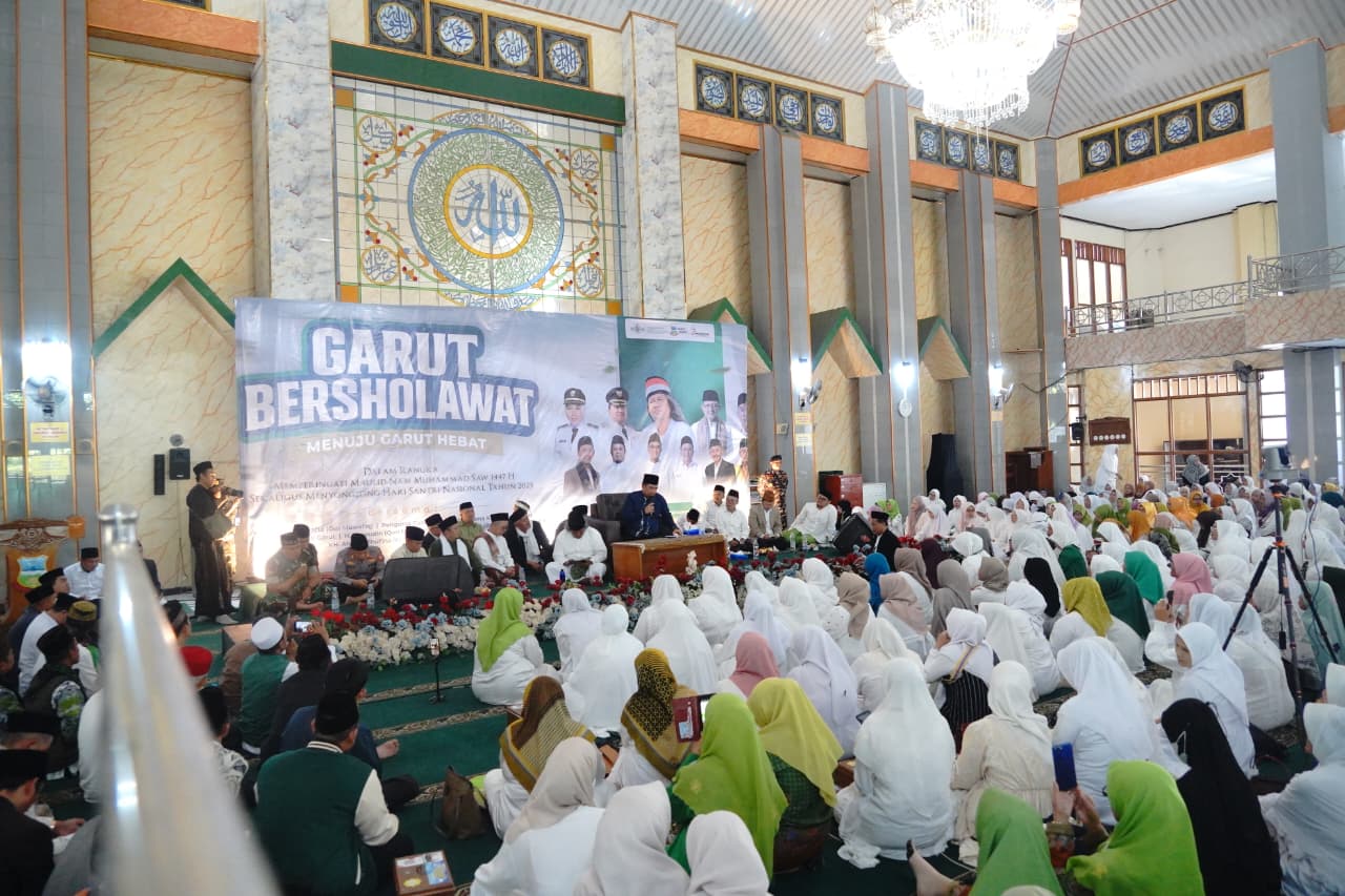 Peringatan Maulid Nabi Muhammad SAW 1447 H sekaligus penyambutan Hari Santri Nasional 2025 bertema “Garut Bershalawat Menuju Garut Hebat Bersama Gus Muwafid” digelar di Masjid Agung Garut, Sabtu (4/10/2025).