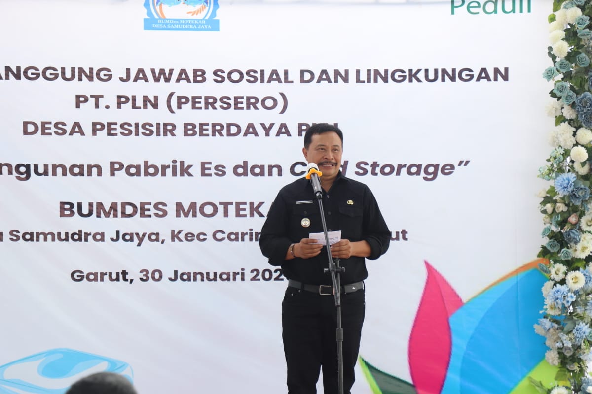 GARUT BERKABAR, Caringin – Penjabat (Pj) Bupati Garut, Barnas Adjidin, meresmikan Pabrik Es dan Cold Storage di Desa Samuderajaya, Kecamatan Caringin, Kabupaten Garut, Kamis (30/1/2025). Fasilitas ini merupakan bantuan dari program Tanggung Jawab Sosial dan Lingkungan (TJSL) PT PLN Unit Induk Distribusi (UID) Jawa Barat untuk meningkatkan kesejahteraan nelayan di wilayah pesisir Garut.