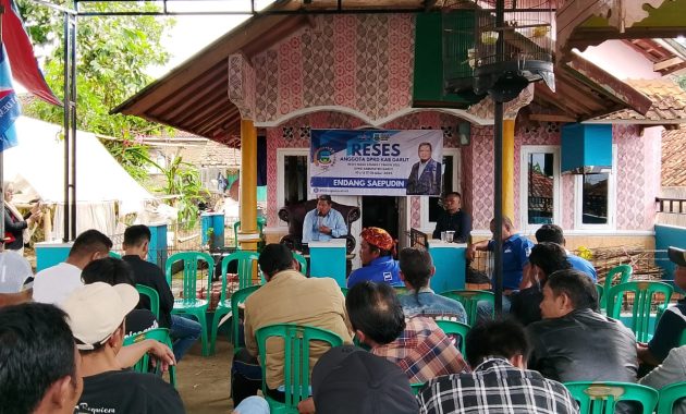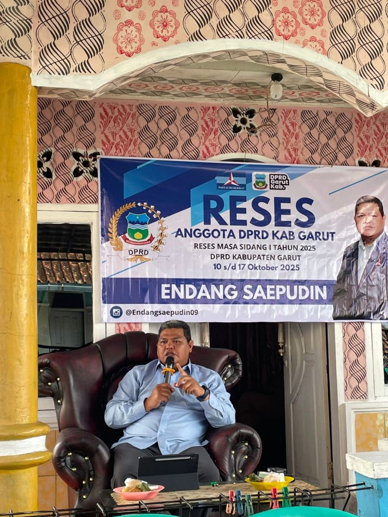 Anggota DPRD Garut, Endang Saepudin, saat mendengarkan keluhan warga dalam kegiatan reses di Kampung Tajursela, Desa Sukarahayu, Kecamatan Wanaraja. Senin (13/10/2025).