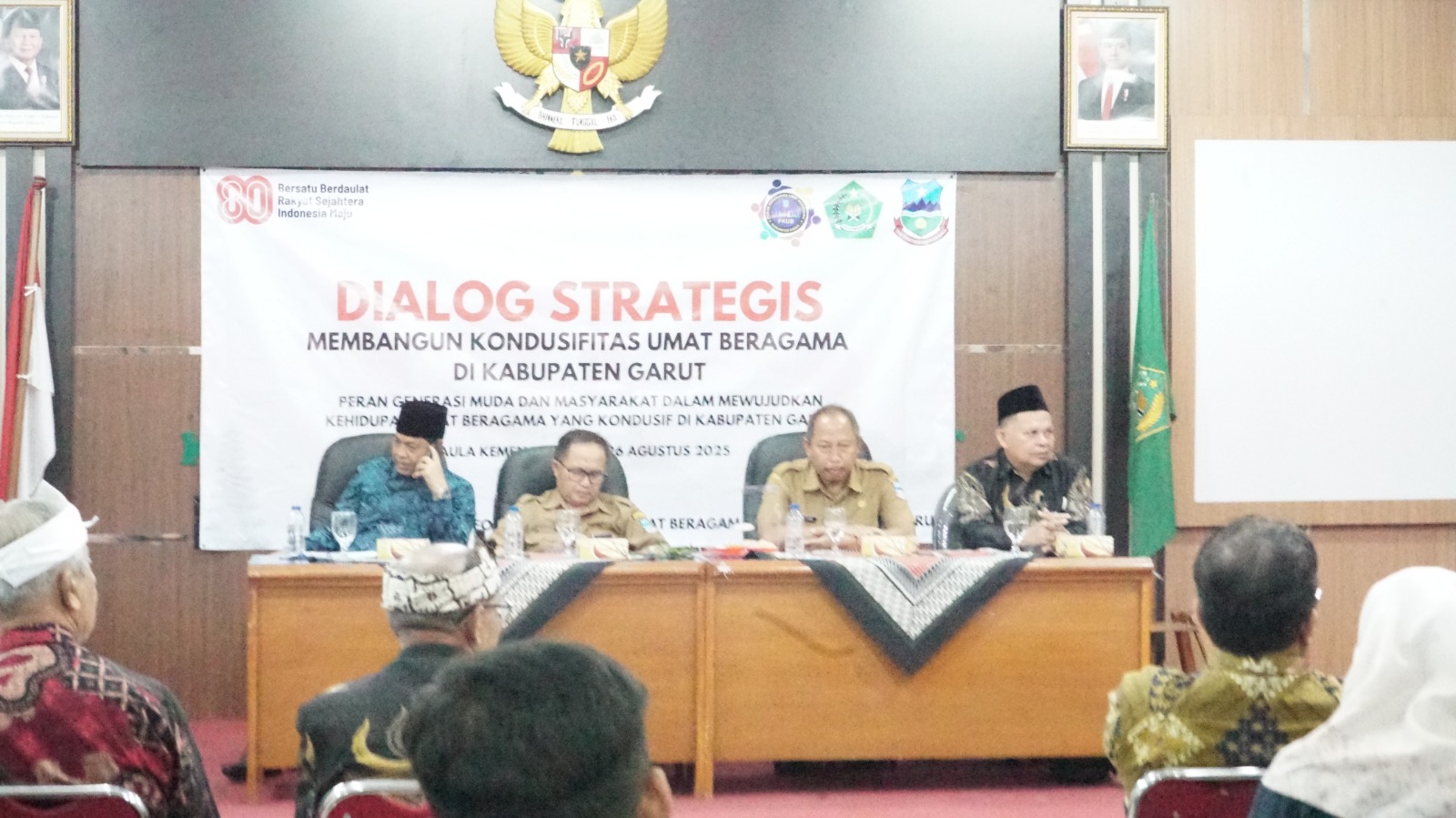 Dialog Strategis FKUB Garut tentang peran generasi muda dan masyarakat dalam menjaga kerukunan umat beragama berlangsung di Aula Kantor Kementerian Agama Kabupaten Garut, Tarogong Kidul, Selasa (26/8/2025).