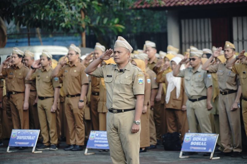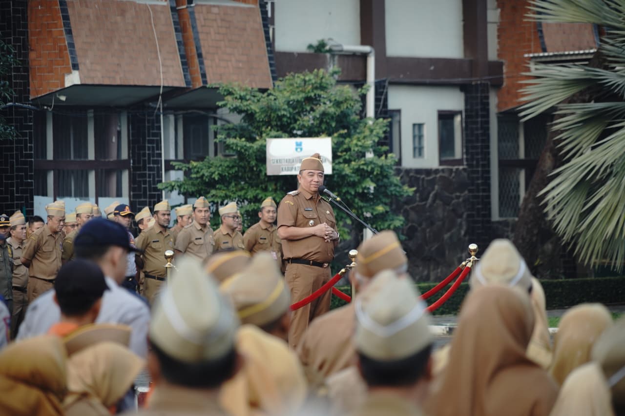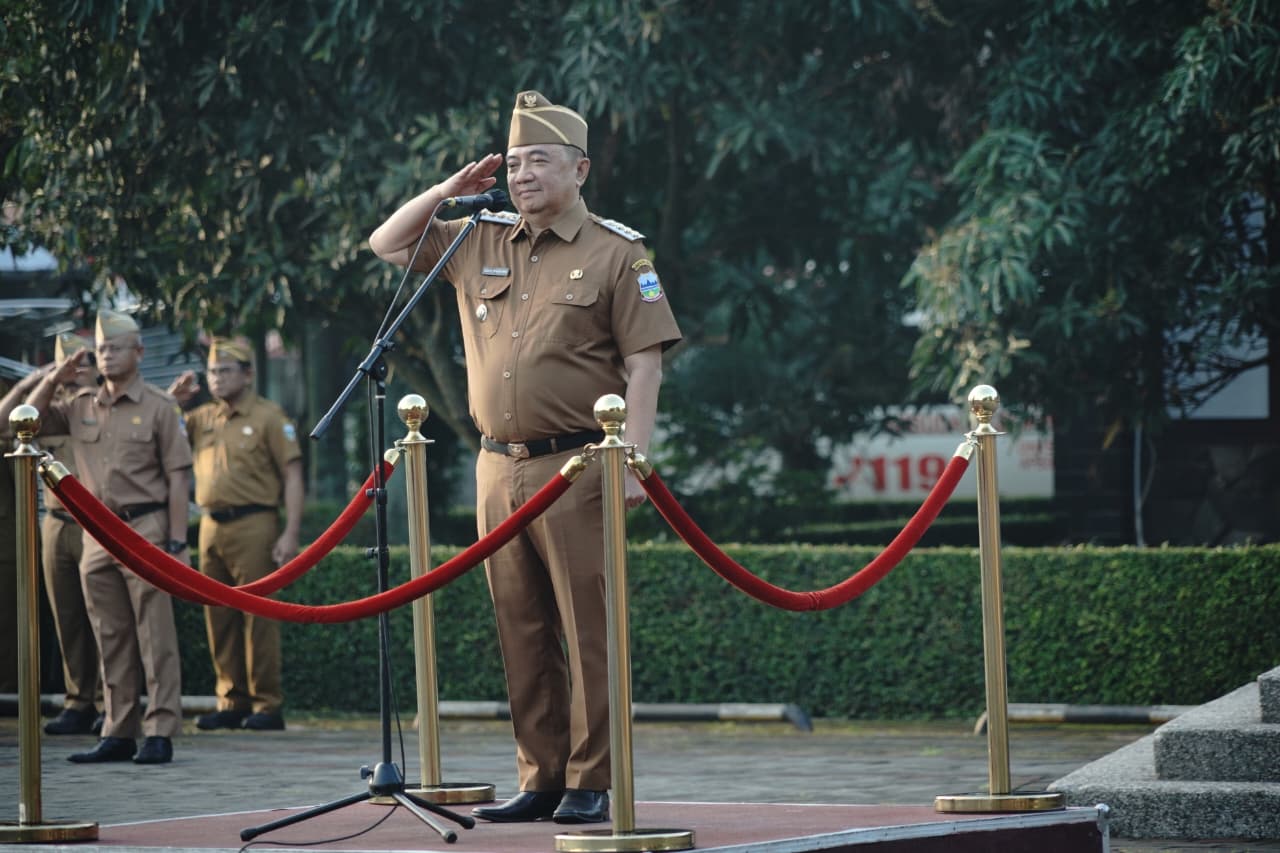 Bupati Garut memimpin Apel Gabungan ASN di Lapang Sekretariat Daerah (Setda) Garut, Jalan Pembangunan, Kecamatan Tarogong Kidul, Senin (9/3/2026).