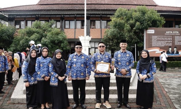 Bupati Garut, Abdusy Syakur Amin, menyerahkan penghargaan kepada Kepala Desa Barusari, Ahmad Gunawan, atas prestasinya meraih Juara 3 Peacemaker Justice Award 2025 pada Upacara HUT KORPRI ke-54.