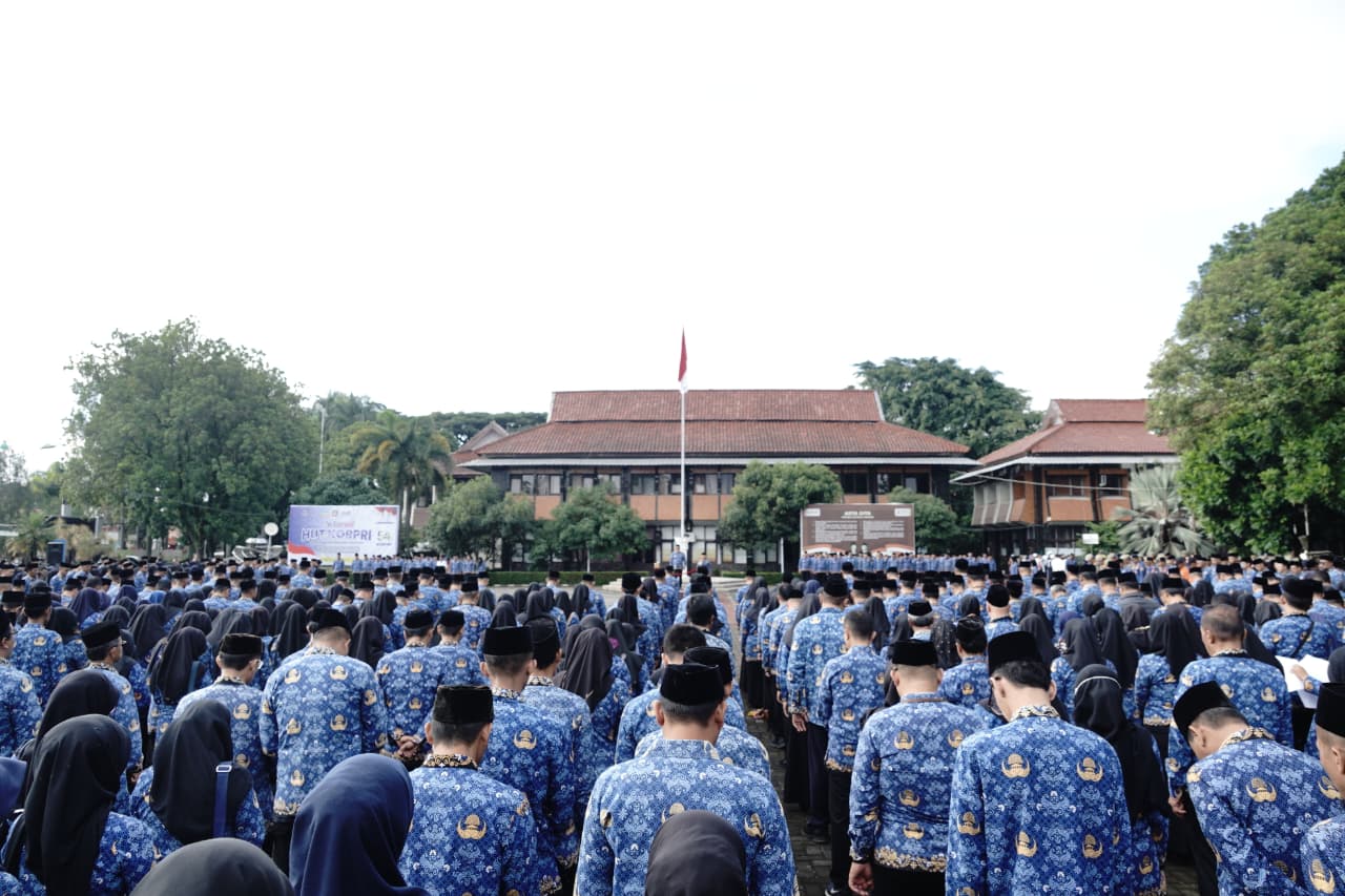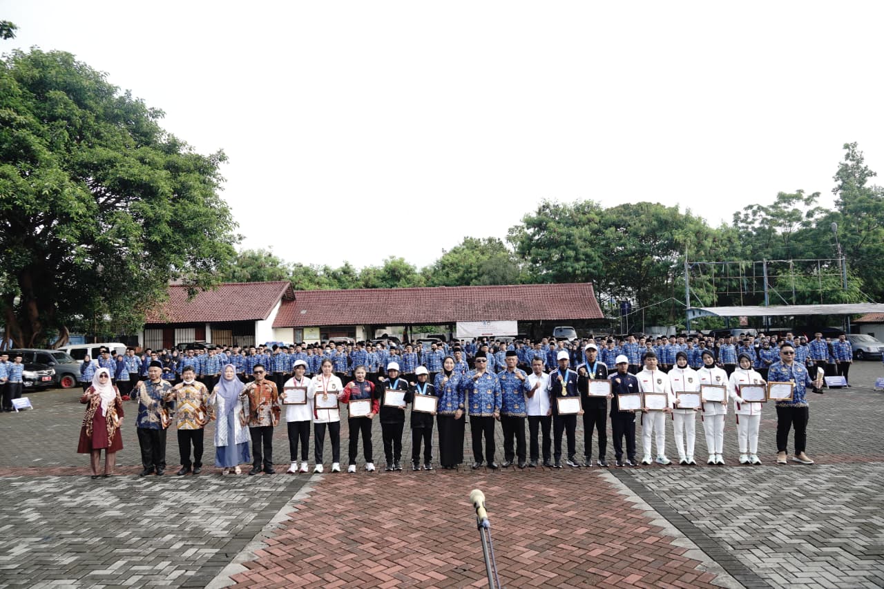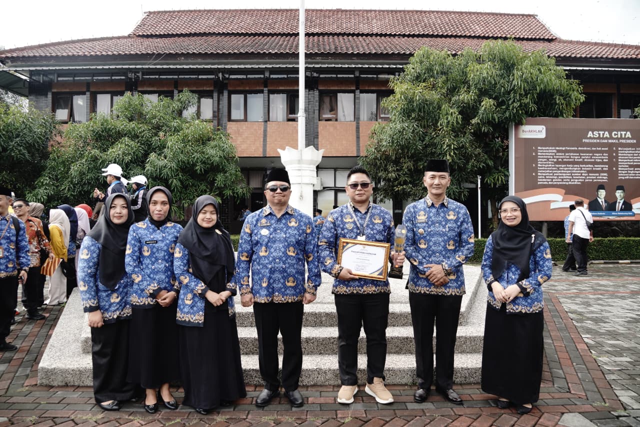 Bupati Garut, Abdusy Syakur Amin, menyerahkan penghargaan kepada Kepala Desa Barusari, Ahmad Gunawan, atas prestasinya meraih Juara 3 Peacemaker Justice Award 2025 pada Upacara HUT KORPRI ke-54.