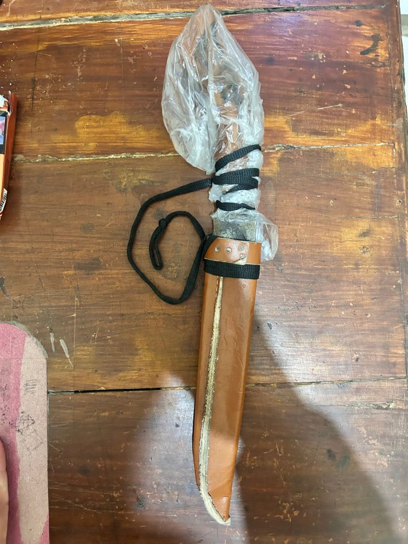 Petugas Polsek Pameungpeuk saat mengamankan pelaku penganiayaan beserta barang bukti sebilah pisau di lokasi kejadian.Senin (24/11) Kemarin, Selasa (25/11/2025).