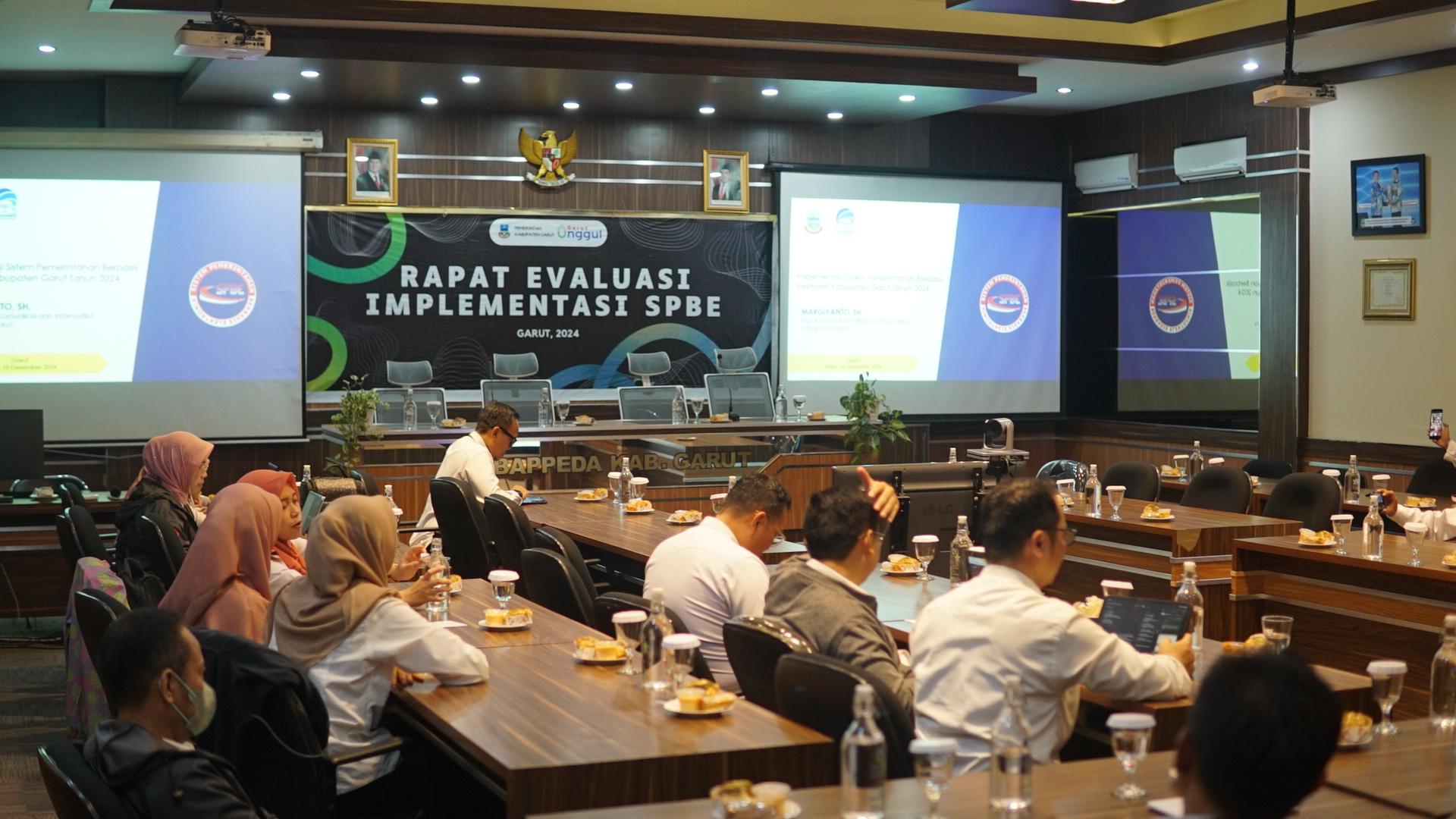 GARUT BERKSBAR, Tarogong Kidul – Pemerintah Kabupaten Garut melalui Badan Perencanaan Pembangunan Daerah (BAPPEDA) menyelenggarakan kegiatan Evaluasi dan Implementasi Sistem Pemerintahan Berbasis Elektronik (SPBE) di Ruang Rapat BAPPEDA, Jalan Patriot, Kecamatan Tarogong Kidul, Rabu (18/12/2024).