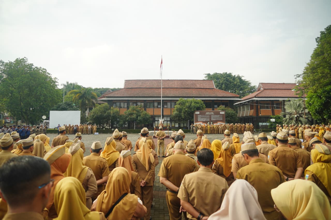 Bupati Garut, Abdusy Syakur Amin, memimpin Apel Gabungan sekaligus menerima penyerahan Sertipikat Hak Pakai Tanah Milik Pemerintah Kabupaten Garut di Lapangan Apel Sekretariat Daerah Kabupaten Garut, Kecamatan Tarogong Kidul, Senin (12/1/2026).