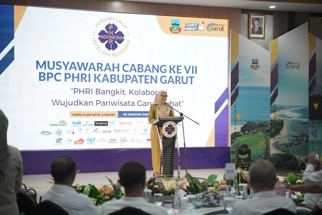 Wakil Bupati Garut, Putri Karlina, menghadiri Musyawarah Cabang (Muscab) ke-VII Badan Pimpinan Cabang Perhimpunan Hotel dan Restoran Indonesia (BPC PHRI) Kabupaten Garut di Sabda Alam Hotel Resort, Kecamatan Tarogong Kaler, Senin (26/1/2026).