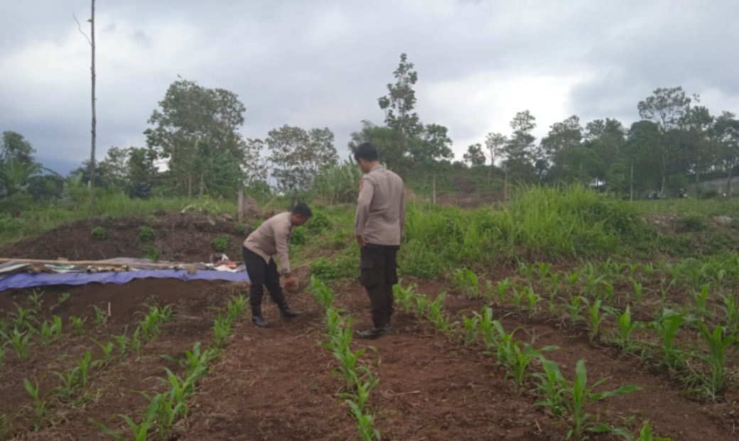 Kapolsek Leles AKP Wawan bersama anggota dan Pok Tani Pusaka Tani rawat lahan jagung seluas 1 hektar di Desa Margaluyu. Langkah ini jadi bukti nyata dukungan Polri terhadap ketahanan pangan, bahkan di tengah musim kemarau. Jumat (22/8/2025).