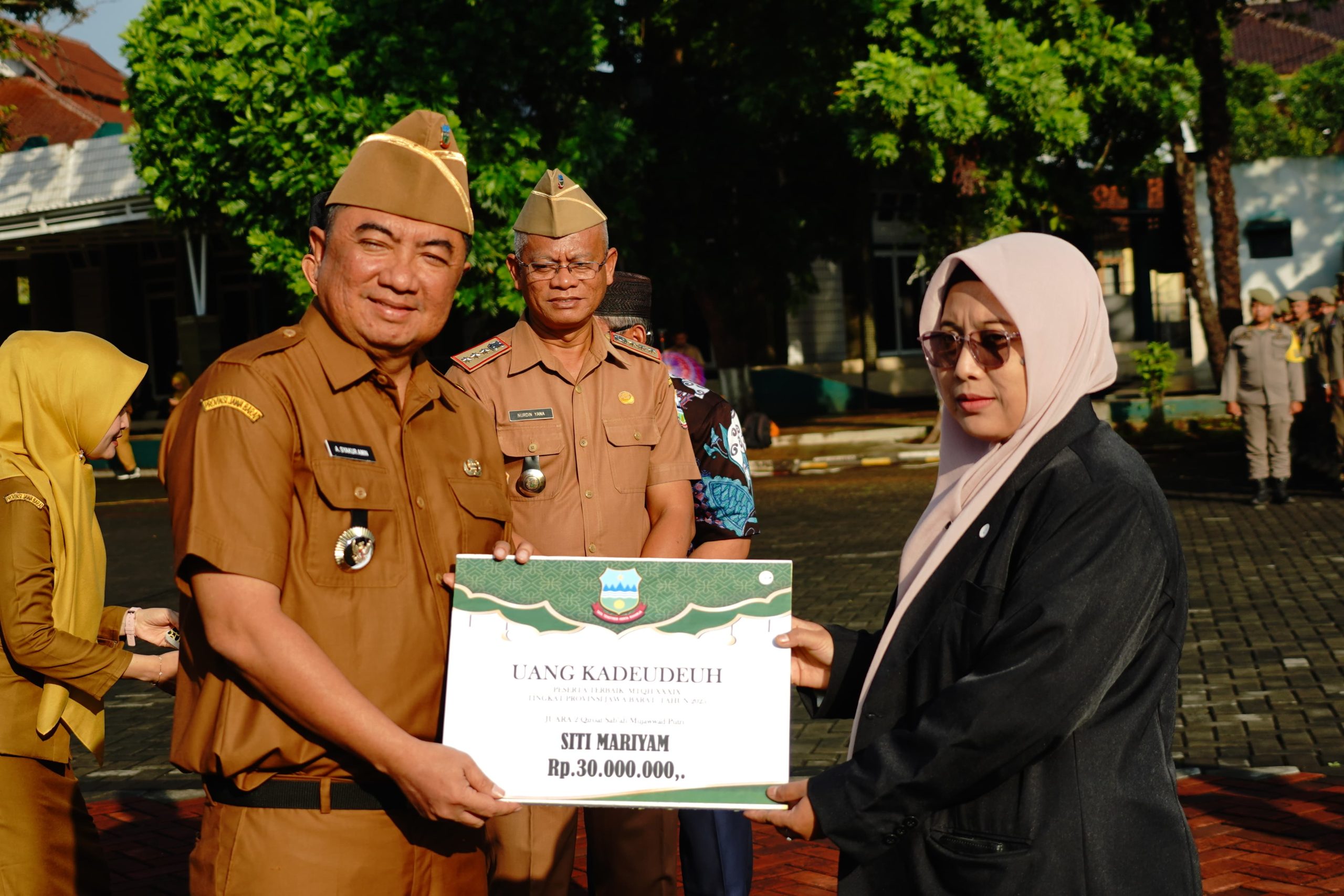 Bupati Garut, Abdusy Syakur Amin, secara simbolis menyerahkan uang kadeudeuh kepada pemenang MTQH XXXIX Tingkat Provinsi Jawa Barat Tahun 2025, Senin (7/7/2025), di Lapangan Apel Setda Garut.