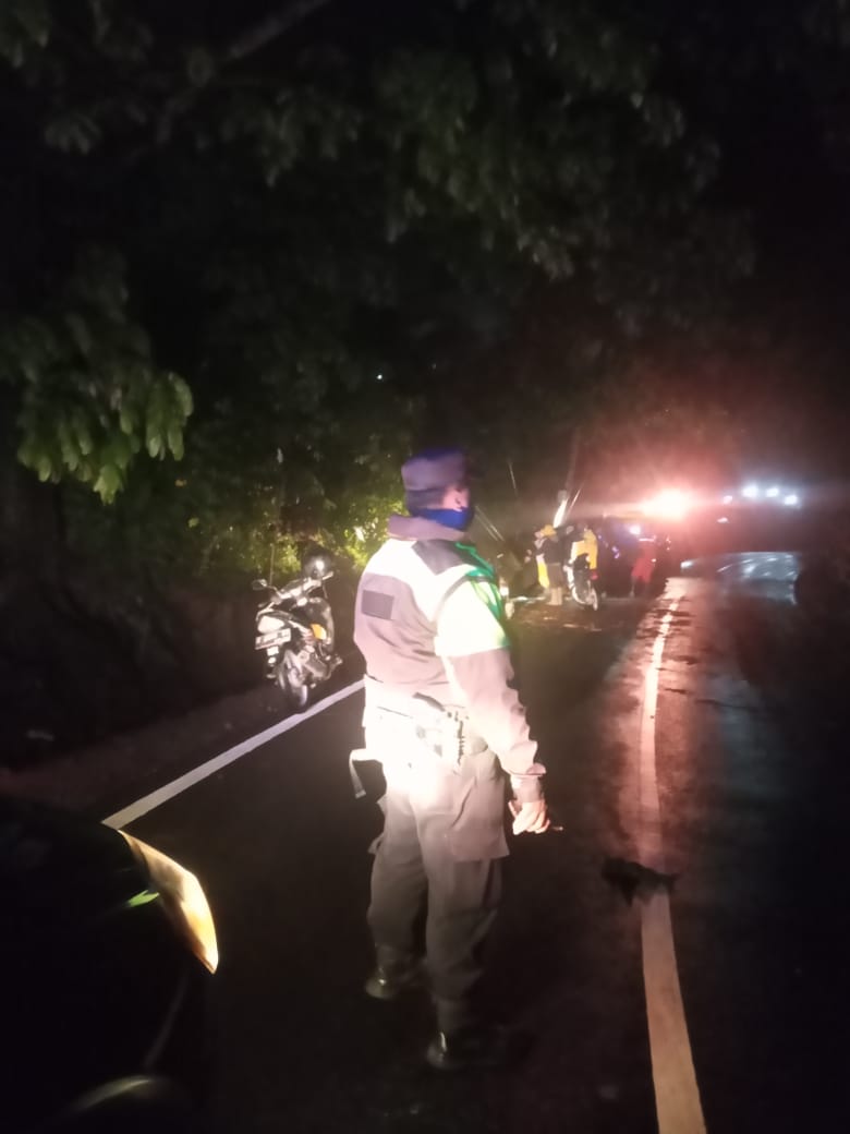 Petugas Polsek Cisurupan bersama instansi terkait saat mengevakuasi pohon tumbang yang menghalangi Jalan Raya Cisurupan–Cikajang, Minggu malam (31/8/2025).