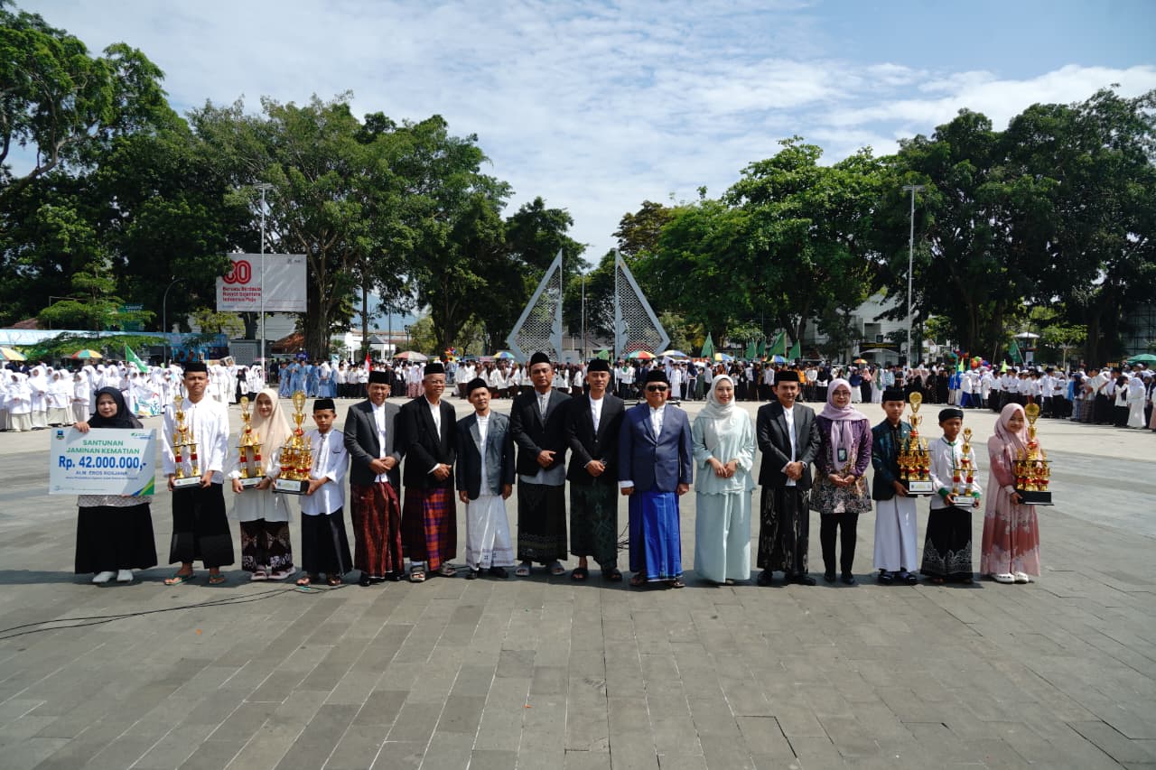 Dalam rangkaian acara, Pemkab Garut juga menyerahkan santunan Jaminan Kematian sebesar Rp 42.000.000 kepada keluarga almarhum Eros Rosjana, serta mengumumkan para pemenang lomba Hari Santri Nasional 2025.