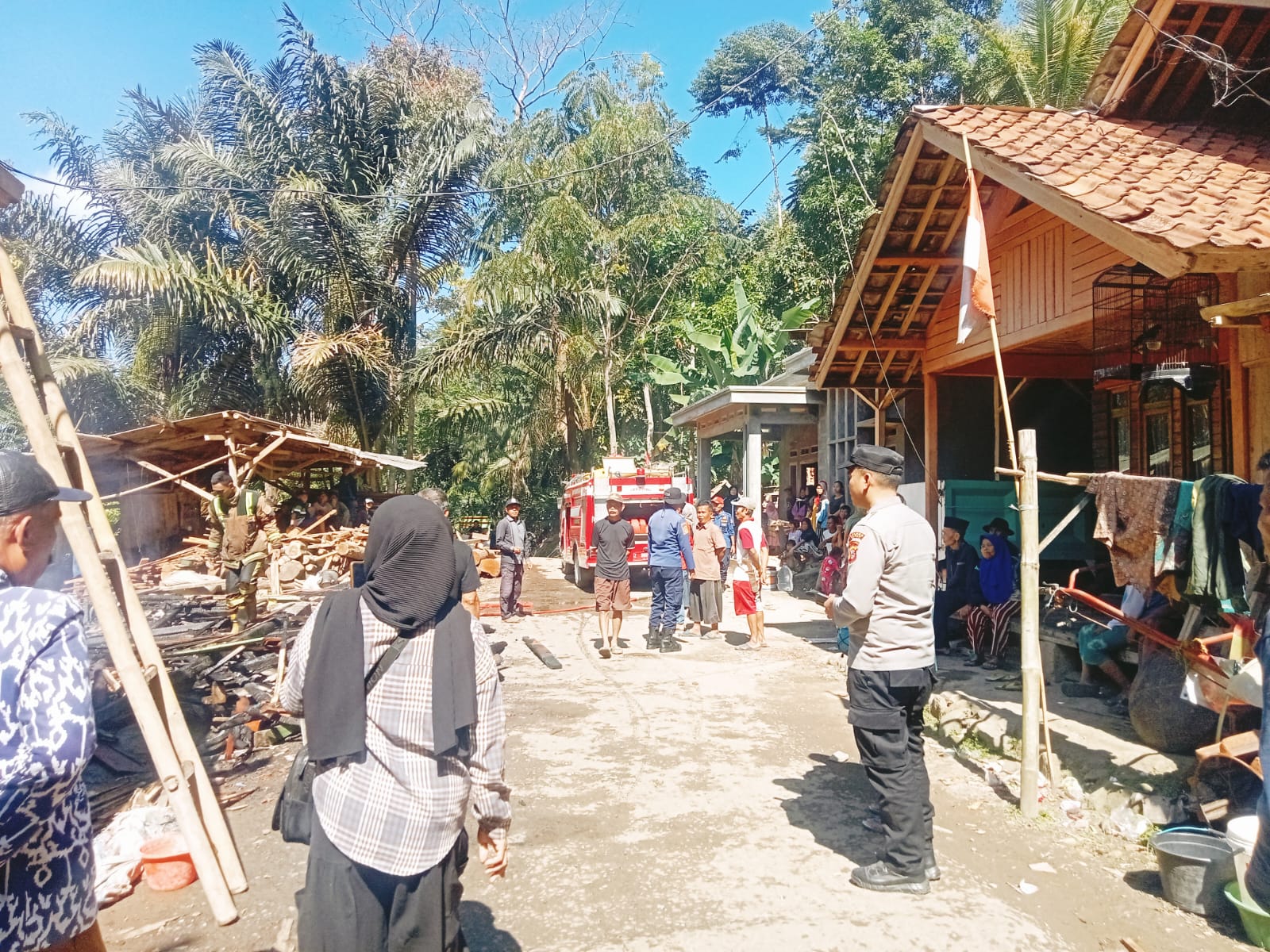 Petugas Polsek Pakenjeng saat melakukan pengecekan TKP kebakaran rumah panggung di Desa Pasirlangu, Kecamatan Pakenjeng, Selasa (26/8/2025).