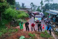 Personel Polsek Pakenjeng bersama aparat desa melakukan pengecekan dan pengamanan lokasi tanah longsor di Jalan Raya Pakenjeng–Bungbulang, Desa Depok, Kecamatan Pakenjeng. Selasa (11/11/2025). GARUT…