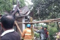 Petugas Polsek Banyuresmi bersama warga mengevakuasi pohon tumbang yang menimpa rumah warga di Desa Binakarya akibat hujan dan angin kencang. pada Rabu (5/11/2025). GARUT…