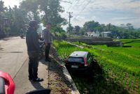 Personel Polsek Leuwigoong saat melakukan pengecekan dan pengamanan di lokasi kecelakaan tunggal Honda CR-V yang terperosok ke area persawahan.Sabtu pagi (22/11/2025) GARUT BERKABAR, Leuwigoong…