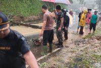 Petugas Polsek Cisompet bersama TNI, PLN, dan warga bergotong royong membersihkan material longsor dan menangani tiang listrik tumbang di Kampung Nyalindung. Minggu (23/11/2025). GARUT…