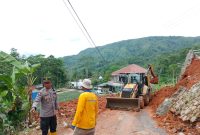 Personel Polsek Singajaya bersama TNI, BPBD, dan warga bergotong royong membersihkan material longsor di jalur Peundeuy–Toblong hingga akses jalan kembali normal, Selasa (28/10/2025). GARUT…