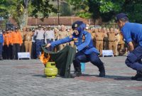 Petugas Dinas Pemadam Kebakaran (Disdamkar) Kabupaten Garut melakukan Simulasi Penanganan Kebakaran Mandiri dalam apel gabungan di Lapangan Sekretariat Daerah, Tarogong Kidul, Senin (6/10/2025). GARUT…