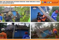 Petugas BPBD Kabupaten Garut bersama Disdamkar dan Forkopimcam Cibatu melakukan asesmen dan pembersihan material pohon kelapa yang menimpa atap rumah warga akibat angin kencang…