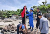 Petugas Sat Polairud Polres Garut memasang bendera merah dan spanduk imbauan larangan berenang di kawasan Pantai Selatan Garut sebagai langkah pencegahan kecelakaan laut jelang…