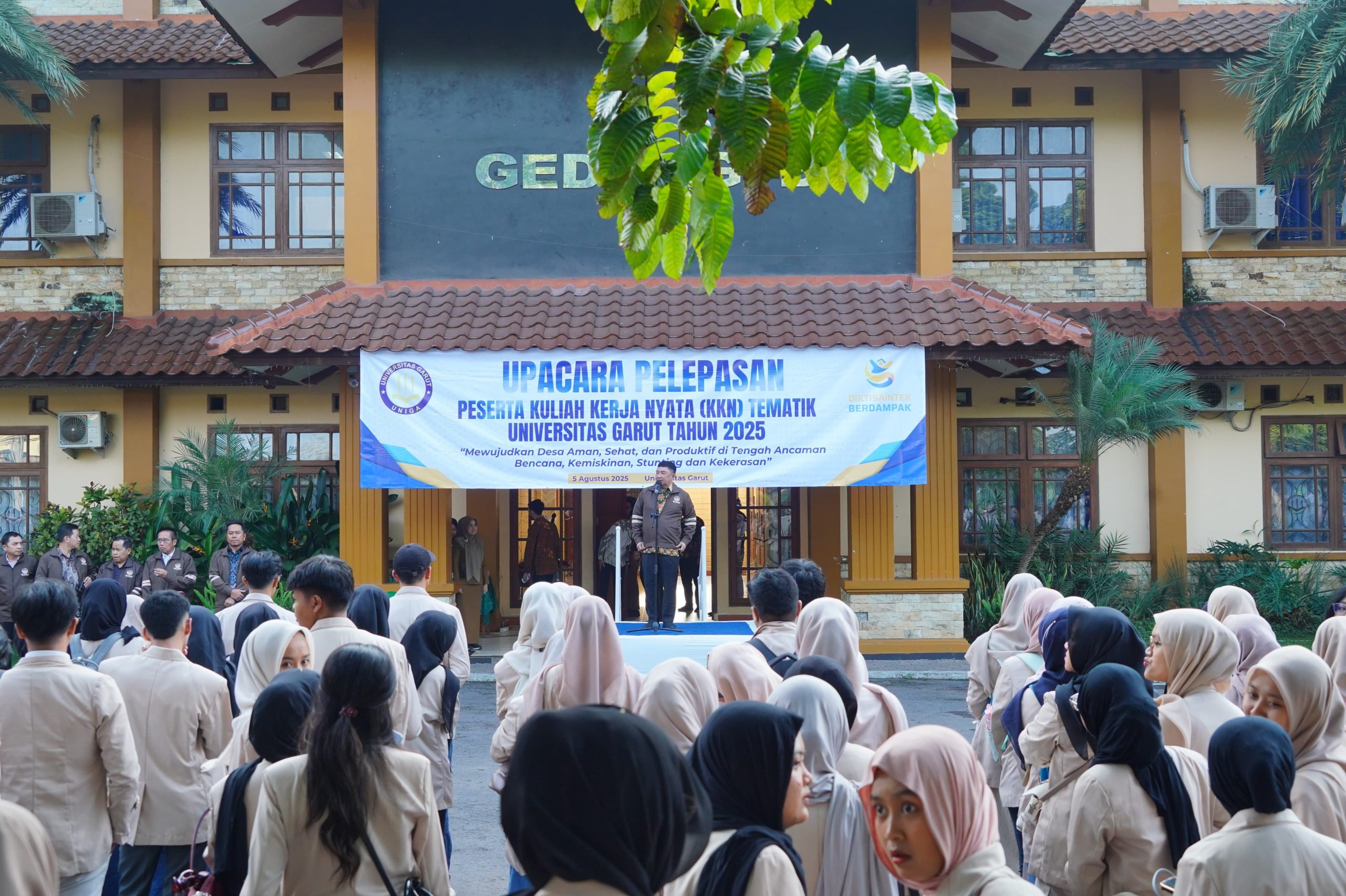 Momen pelepasan peserta Kuliah Kerja Nyata (KKN) Tematik Universitas Garut Tahun 2025, di Lapangan Gedung B UNIGA Kampus I, Tarogong Kaler, Garut, Selasa (5/8/2025).