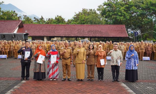 Momen haru pelepasan ASN yang memasuki masa purnabakti berlangsung dalam apel gabungan Pemkab Garut, dipimpin Wakil Bupati Putri Karlina di Lapangan Sekretariat Daerah, Tarogong Kidul, Senin (3/11/2025).